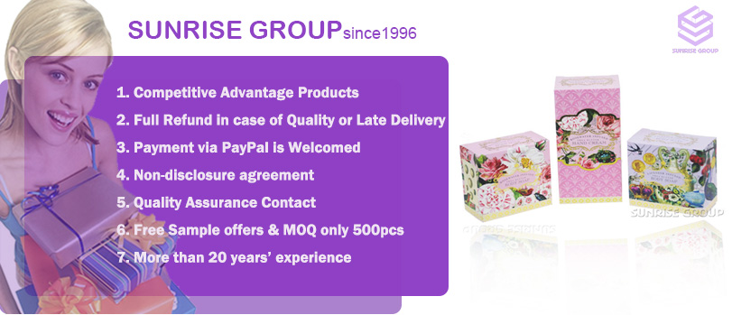 Established in 1996, Sunrise Group is professional manufacturer of packaging products, such as gift box, paper box, jewelry box, watch box, packaging box, wine box, chocolate box, cosmetic box, perfume box, foldable box, display box, leather box, round box, paper bags and drawer box. You name it, we specialize in it!
