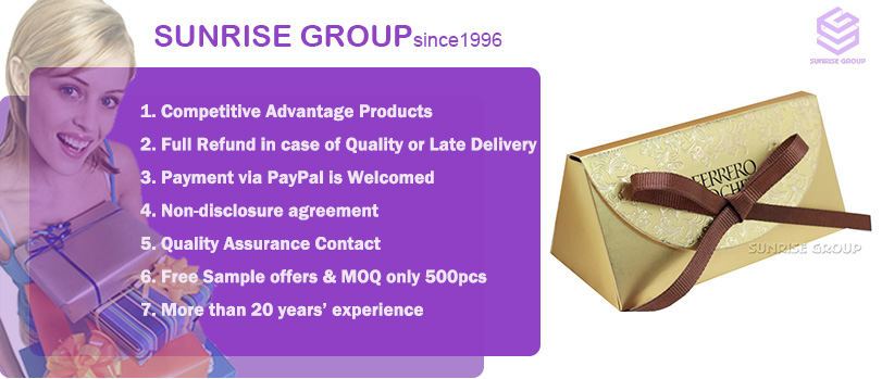 Established in 1996, Sunrise Group is professional manufacturer of packaging products, such as gift box, paper box, jewelry box, watch box, packaging box, wine box, chocolate box, cosmetic box, perfume box, foldable box, display box, leather box, round box, paper bags and drawer box. You name it, we specialize in it!